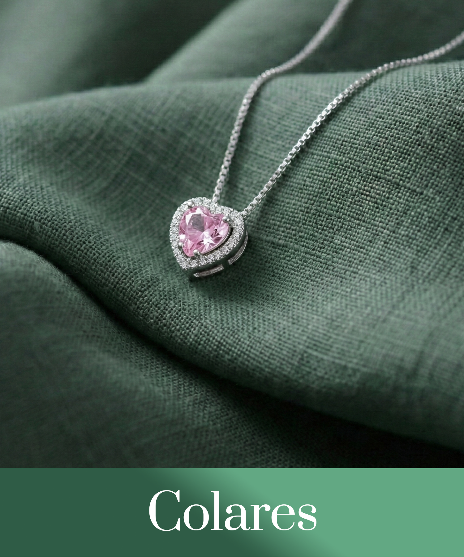 Conjunto de Colar e Brinco de Prata Coração Cravejado Rosa